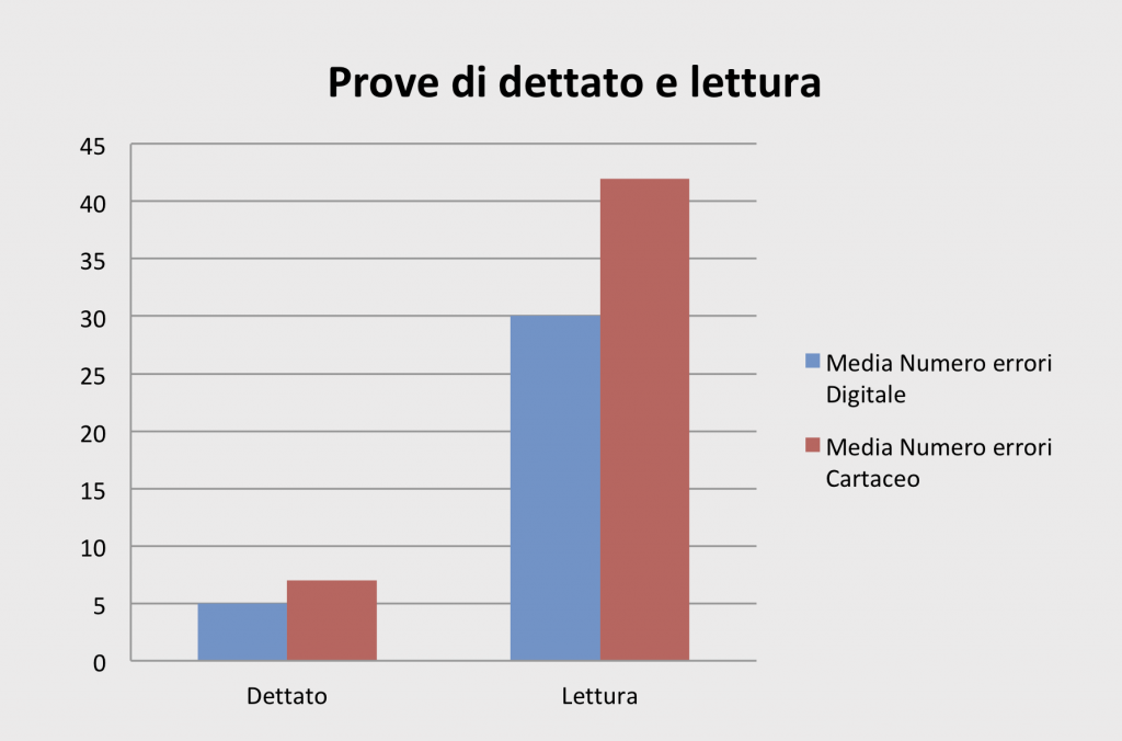 Lo stesso vale per il dettato e la lettura, anche se dall’istogramma potrebbe sembrare che i bambini che hanno meno dimestichezza con il digitale hanno fatto più̀ errori sia nel dettato che nella lettura. Da un’analisi più̀ approfondita dei dati, però, non emergono differenze significative tra chi usa il digitale e chi invece carta e penna.