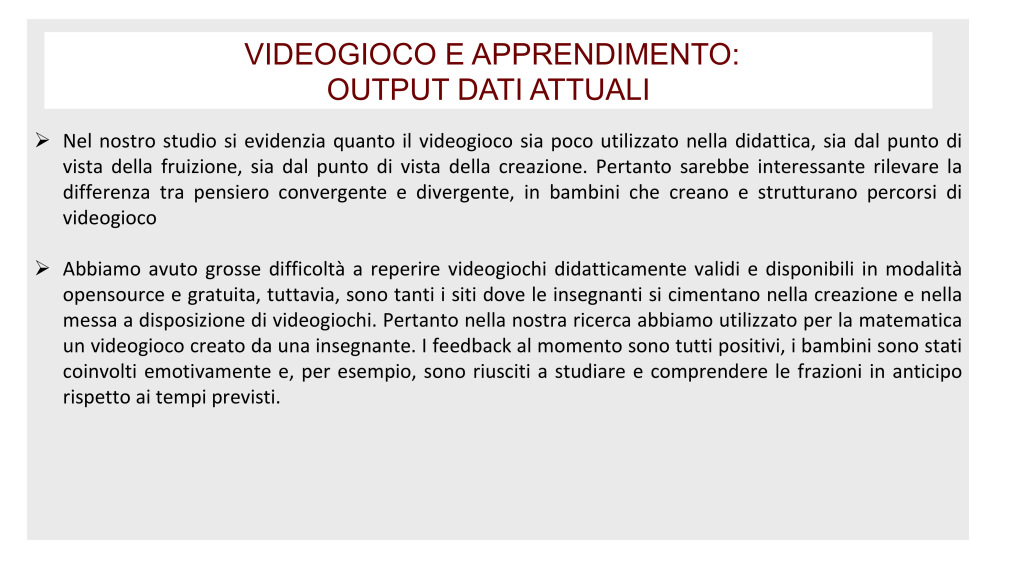 Dai dati emersi dalla ricerca, a seguito di questionari e sperimentazioni effettuati, possiamo considerare positivamente i risultati ottenuti, in merito all’utilizzo del videogioco nella didattica, dal momento in cui si è verificato che “il lavoro fatto utilizzando il videogioco incide tantissimo sulla motivazione dei bambini”.